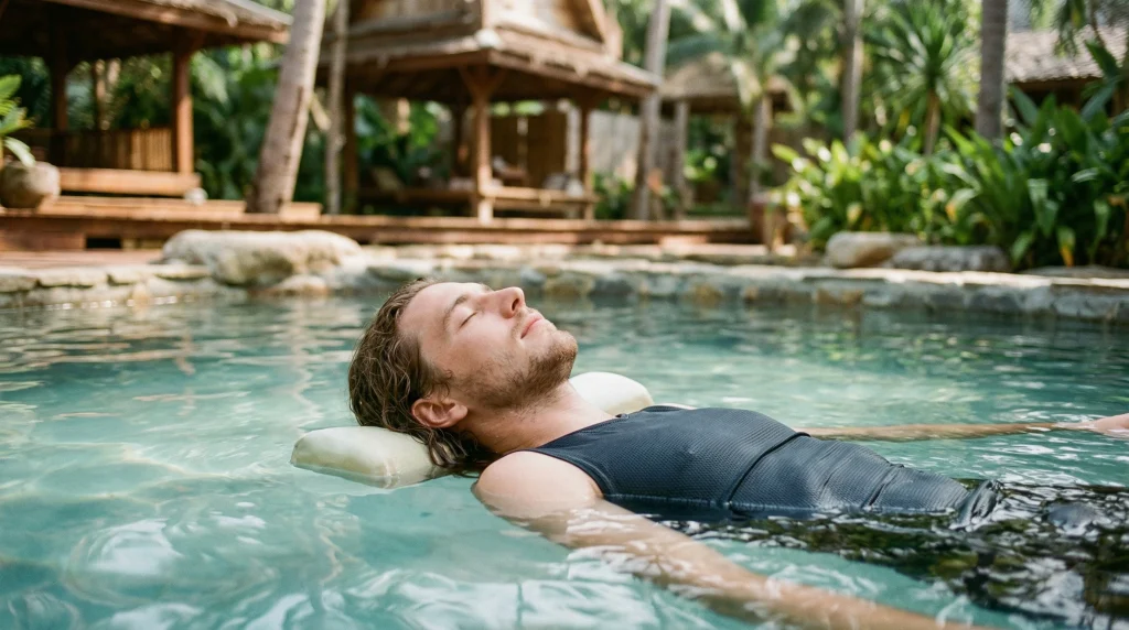 If you are wondering what should I expect during my first aqua tuning therapy session?, imagine a state of total weightlessness. Upon arrival at our specialized aquatic sala on Koh Phangan, you are guided into a purpose-built, warm-water pool. You are fitted with specialized flotation devices that support your head and limbs, allowing you to float effortlessly on the surface.