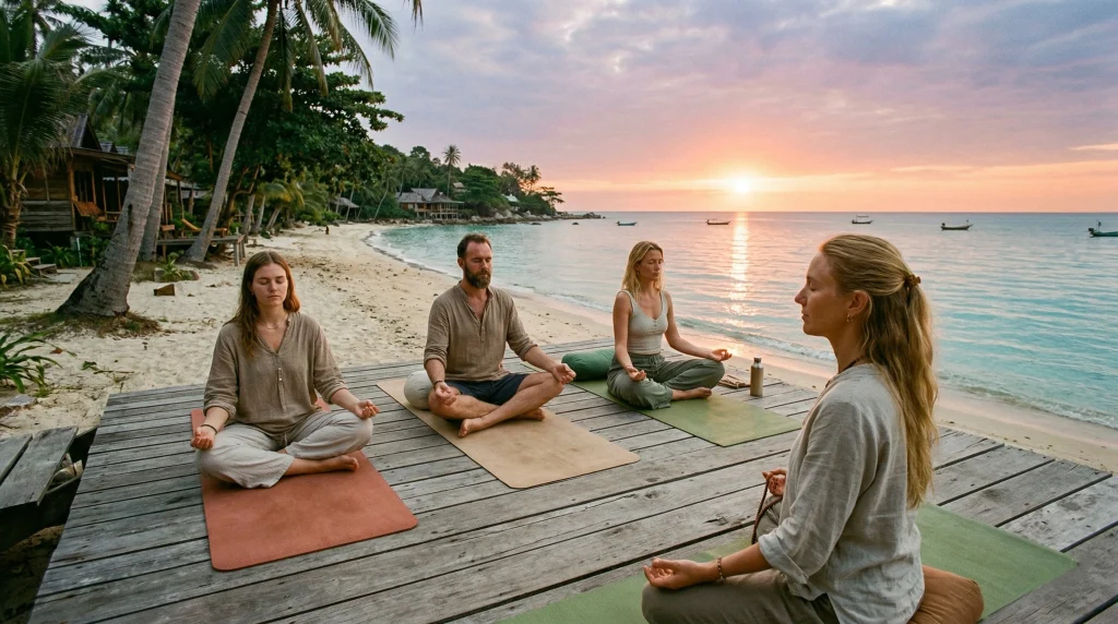 Sunrise Mindfulness: Guided meditation on our beachfront deck as the Gulf of Thailand wakes up.